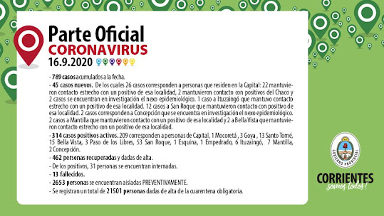 45 casos positivos nuevos, 26 de ellos residen en Capital de los cuales 22 provienen de contacto estrecho con un positivo local, 1 es personal de la salud del Chaco, 1 presta servicio laboral en dicha provincia y de dos personas el nexo epidemiológico está en estudio, 12 personas que residen en San Roque quienes mantuvieron contacto con un positivo de la localidad, 2 personas con residencia en Mantilla que provienen de contacto con un positivo de la localidad, 2 de Concepción cuyo nexo epidemiológico está en investigación, 2 personas residentes en Bella Vista que provienen de contacto estrecho con un positivo de la localidad y 1 persona que reside en Ituzaingó y mantuvo contacto estrecho con uno de los positivos de la localidad. Todos se encuentran aislados y cumpliendo el protocolo correspondiente.