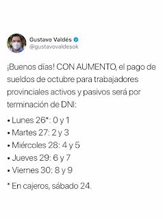 El gobernador Gustavo Valdés anunció este miércoles a través de sus redes sociales, el pago de sueldos correspondiente a octubre para la Administración pública, el cual se informó días atrás que será con aumento. Por el contexto de Emergencia Sanitaria, se realizará a través de la misma modalidad adoptada desde el inicio de la pandemia del Coronavirus, según terminación de Documento Nacional de Identidad (DNI).