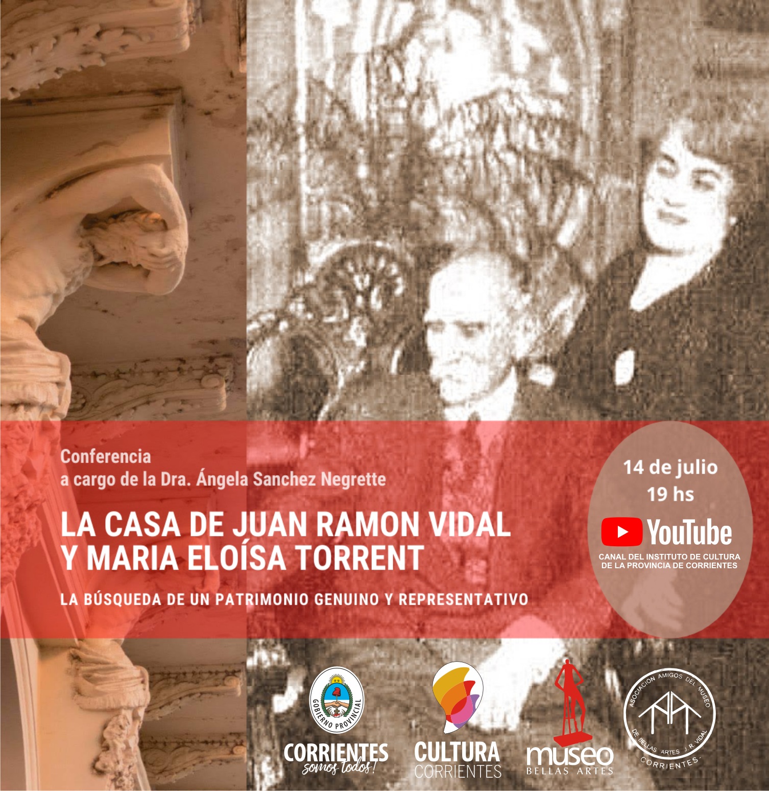 El Instituto de Cultura de la Provincia, la Asociación Amigos del Museo y el Museo de Bellas Artes invitan a ver la emisión del video "La casa de Juan Ramón Vidal y María Eloísa Torrent. La búsqueda de un patrimonio genuino y representativo" a cargo de la Dra. Ángela Sánchez Negrette el día 14 de julio a partir de las 19 hs. en el canal de Youtube del Instituto de Cultura.
