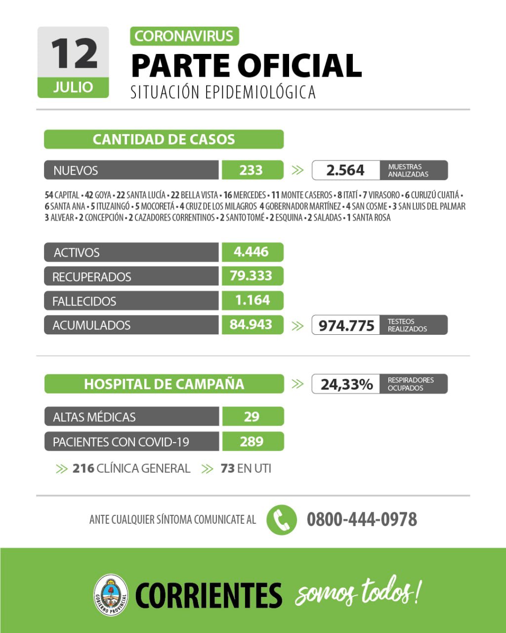 Esto actualiza la cifra de casos activos en 4.446 y los acumulados en 84.943 en todo el territorio provincial al 12 de julio de 2021, con 974.775 testeos realizados desde que inició la pandemia y 79.333 recuperados. Mientras que son 1.164 los fallecidos acumulados y 289 los actuales internados en el Hospital de Campaña, con resultado positivo para Covid-19, estando ocupado el 24.33 % de los respiradores y donde además durante la última jornada, 29 pacientes egresaron con alta médica y 6 fallecieron.