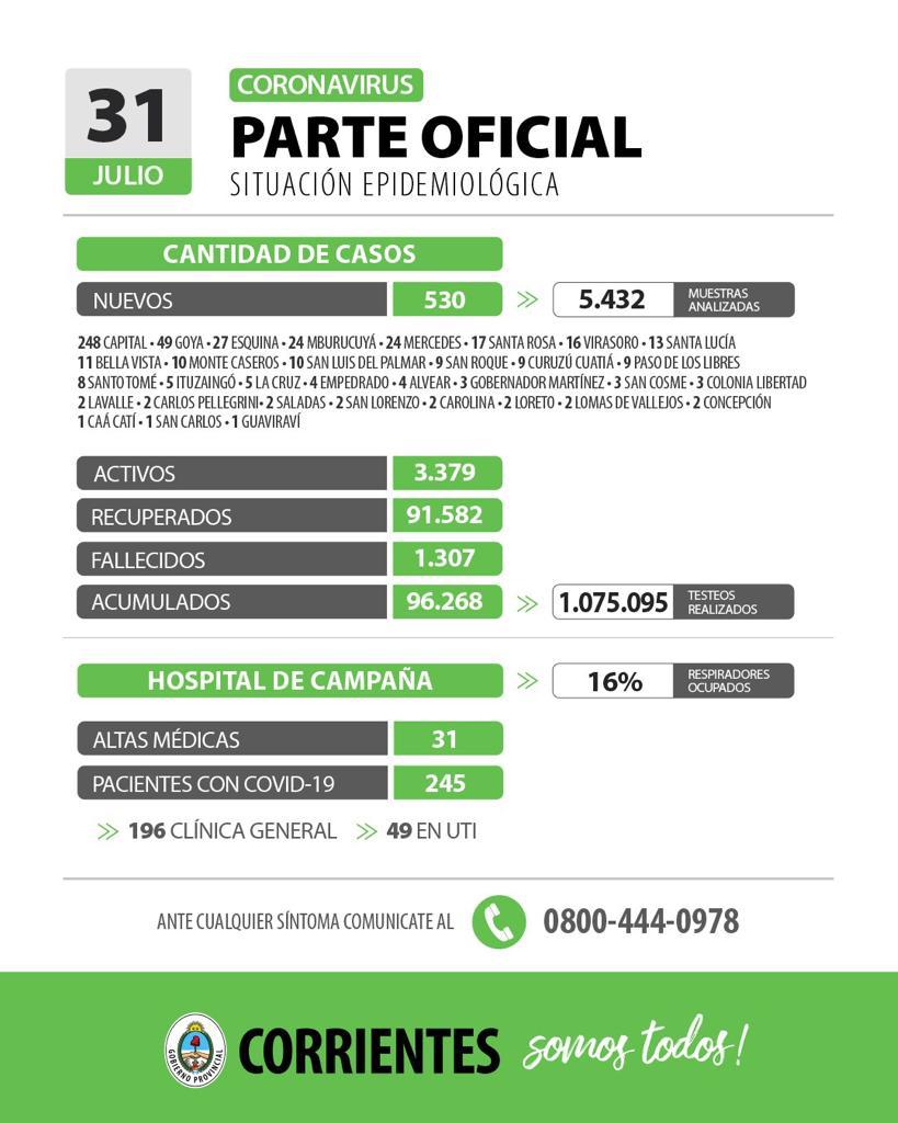 El informe epidemiológico de la provincia de Corrientes registró este sábado 530 nuevos casos positivos de Coronavirus, de los cuales 248 fueron contagios en la ciudad Capital y los 282 restantes en 32 localidades del interior provincial, al haberse analizado 5.432 muestras en las últimas 24 horas.