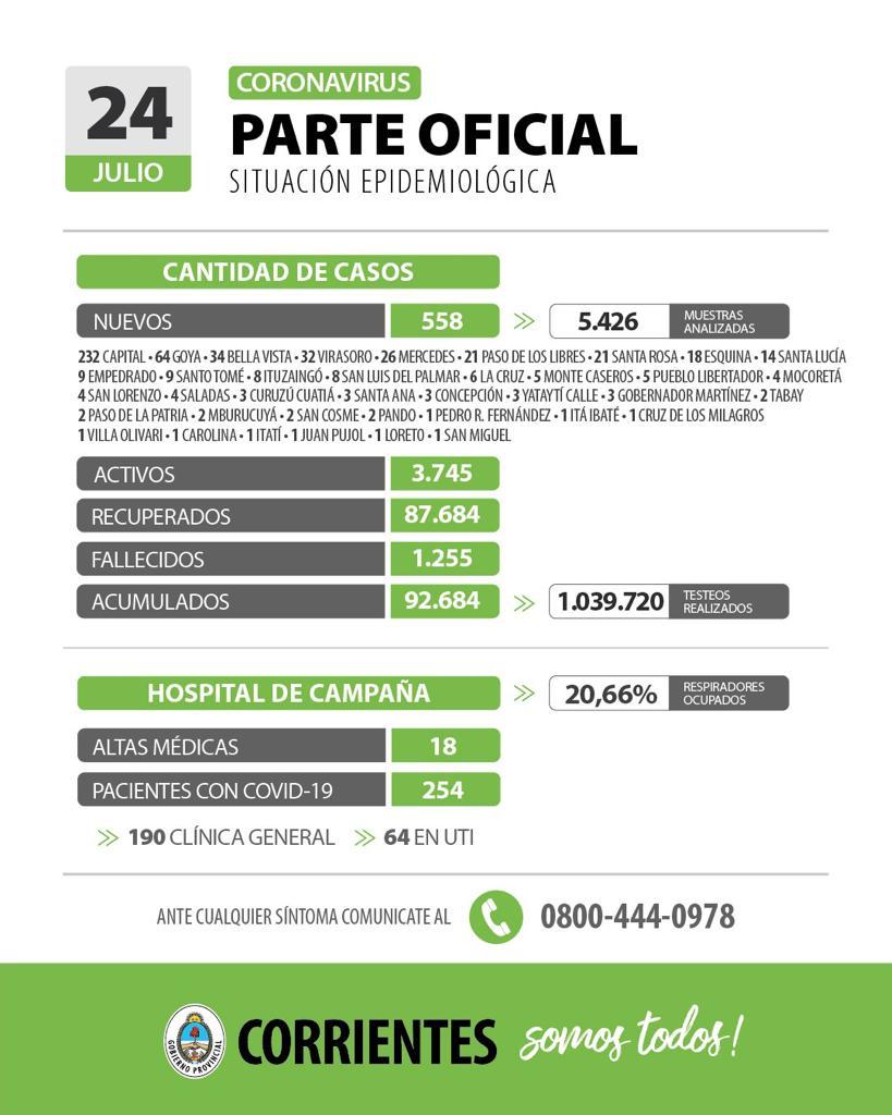 El informe epidemiológico de la provincia de Corrientes registró este sábado, 558 nuevos casos positivos de Coronavirus, de los cuales 232 fueron contagios en la ciudad Capital y los 326 restantes en 37 localidades del interior provincial, al haberse analizado 5.426 muestras en las últimas 24 horas. Esto actualiza la cifra de casos activos en 3.745 y los acumulados en 92.684 en todo el territorio provincial al 24 de julio de 2021, con 1.039.720 testeos realizados desde que inició la pandemia y 87.684 recuperados. Mientras que son 1.255 los fallecidos acumulados y 254 los actuales internados en el Hospital de Campaña, con resultado positivo para Covid-19, estando ocupado el 20.66% de los respiradores y donde además durante la última jornada, 18 pacientes egresaron con alta médica y 7 fallecieron.