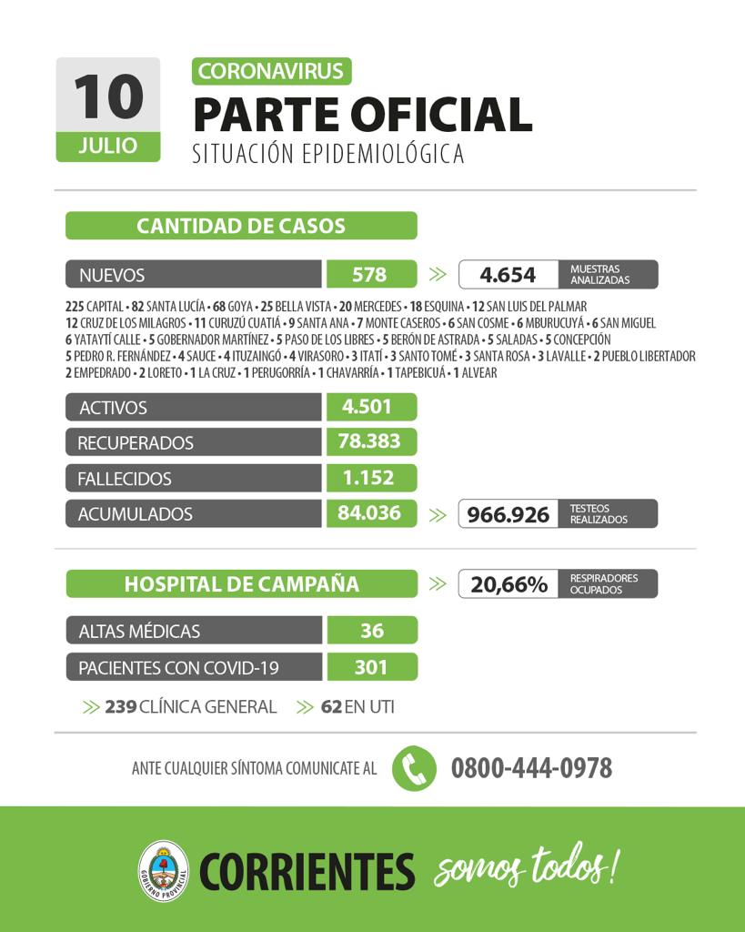 El informe epidemiológico de la provincia de Corrientes registró este sábado, 578 nuevos casos positivos de Coronavirus, de los cuales 225 fueron contagios en la ciudad Capital y los 353 restantes en 35 localidades del interior provincial, al haberse analizado 4.654 muestras en las últimas 24 horas.