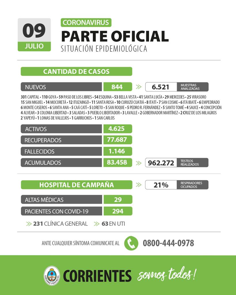 El informe epidemiológico de la provincia de Corrientes registró este viernes 844 nuevos casos positivos de Coronavirus, de los cuales 301 fueron contagios en la ciudad Capital y los 543 restantes en 36 localidades del interior provincial, al haberse analizado 6521 muestras en las últimas 24 horas.