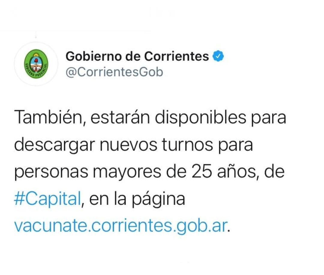 Asimismo señala que “ también estarán disponibles para descargar nuevos turnos para personas mayores de 25 años, de Capital, en la página vacúnate.corrientes.gob.ar”.