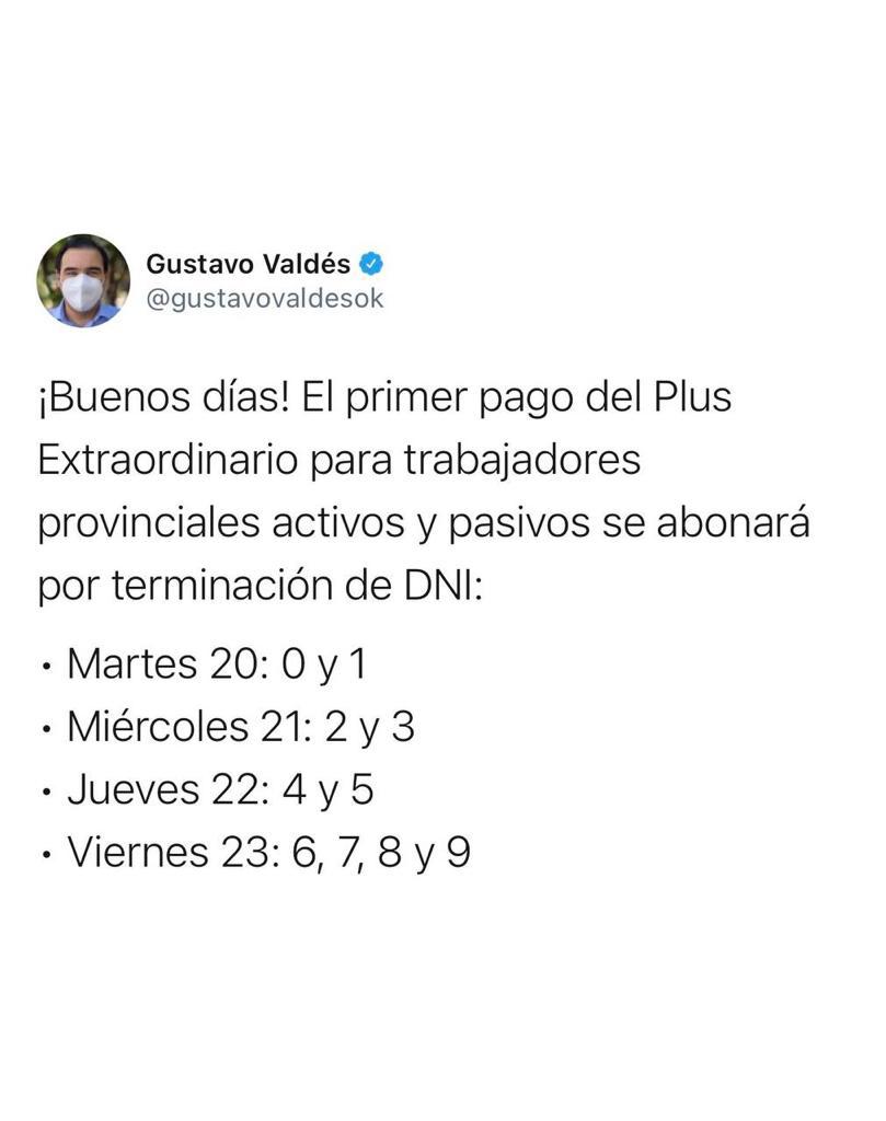 El gobernador Gustavo Valdés informó a través de su cuenta de twitter, que entre este martes, 20 de julio y el viernes 23 de julio, se abonará a los trabajadores provinciales, activos y pasivos, el primero de los dos pagos correspondientes al Plus Extraordinario de $20.000 pesos, que fuera anunciado oportunamente.
