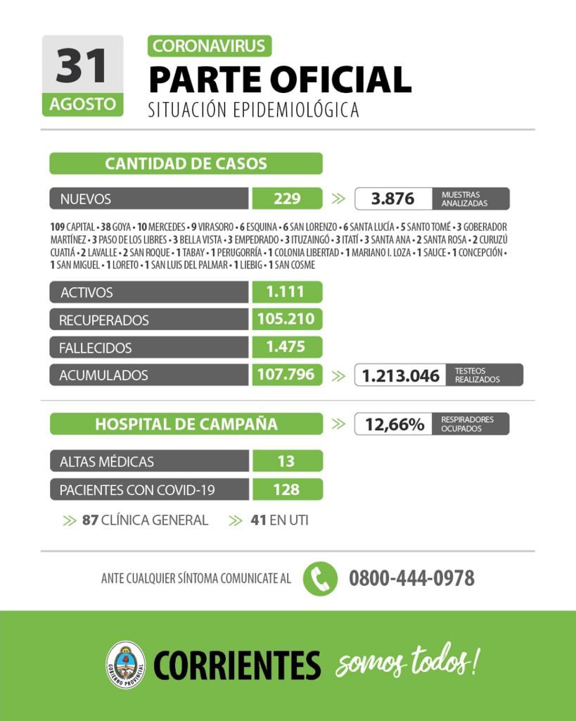 El informe epidemiológico de la provincia de Corrientes registró este martes, 229 nuevos casos positivos de Coronavirus, de los cuales 109 fueron contagios en la ciudad Capital y los 120 restantes en 29 localidades del interior provincial, al haberse analizado 3.876 muestras en las últimas 24 horas. Esto actualiza la cifra de casos activos en 1.111 y los acumulados en 107.796 en todo el territorio provincial al 31 de agosto de 2021, con 1.213.046 testeos realizados desde que inició la pandemia y 105.210 recuperados. Mientras que son 1.475 los fallecidos acumulados y 128 los actuales internados en el Hospital de Campaña, con resultado positivo para Covid-19, estando ocupado el 12,66% de los respiradores y donde además durante la última jornada, 13 pacientes egresaron con alta médica y 2 fallecieron.