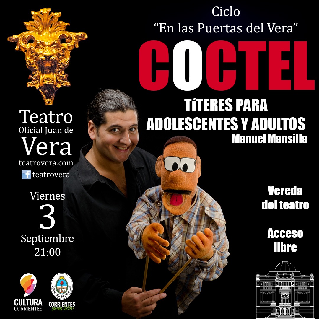 Agenda que comenzará el mismo viernes, a las 21, con el regreso del ciclo “En las puertas del Vera”, y la presentación del espectáculo de títeres “Cóctel”, frente a las escalinatas del coliseo correntino. Una obra apta para adolescentes y adultos, a cargo de Manuel Mansilla, un actor y titiritero oriundo de Lomas de Zamora.