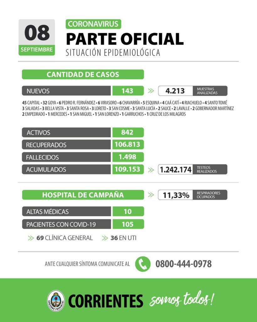 El informe epidemiológico de la provincia de Corrientes registró este miércoles 143 nuevos casos positivos de Coronavirus, de los cuales 45 fueron contagios en la ciudad Capital y los 98 restantes en 23 localidades del interior provincial, al haberse analizado 4213 muestras en las últimas 24 horas.