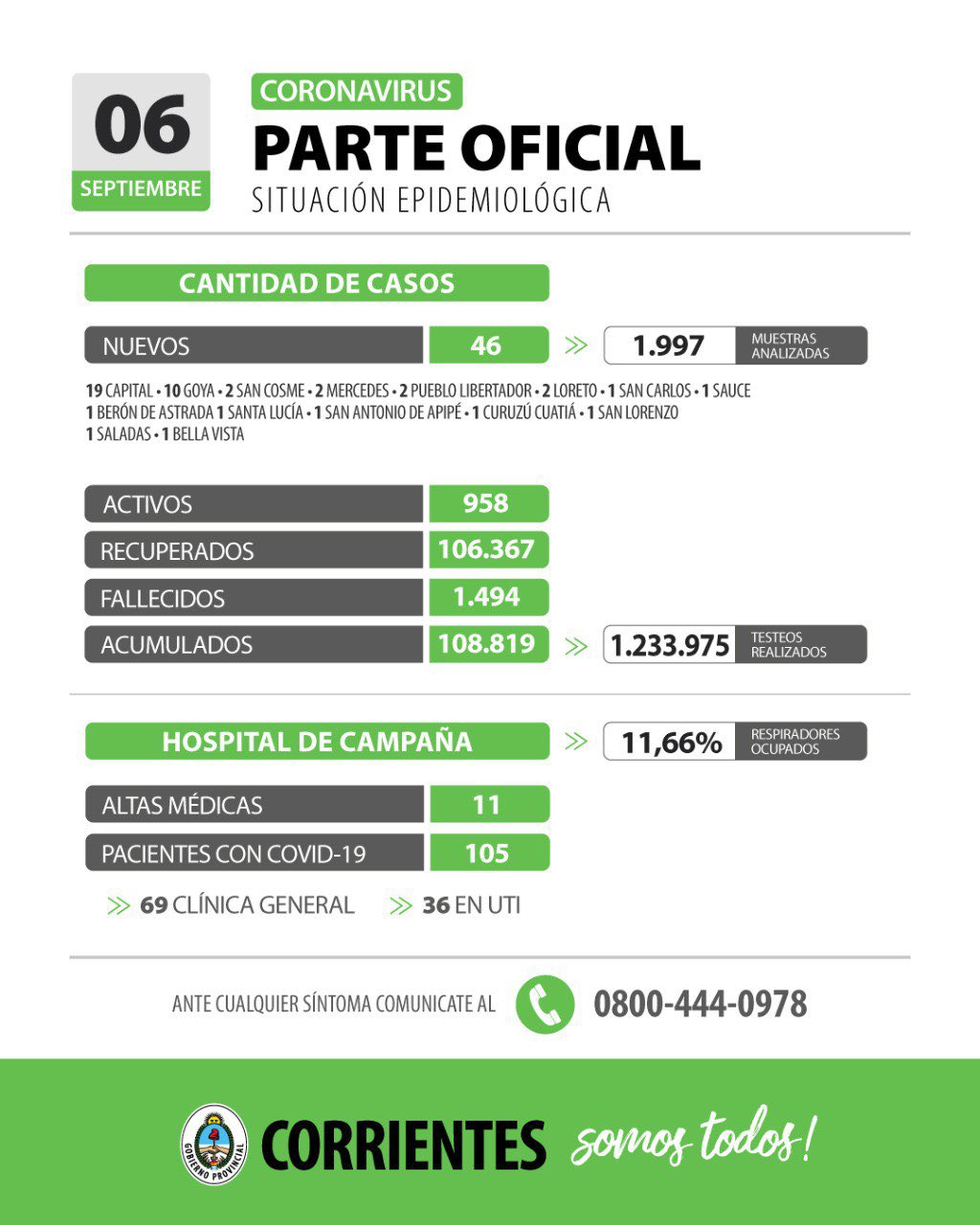 Esto actualiza la cifra de casos activos en 958 y los acumulados en 108.819 en todo el territorio provincial al 6 de septiembre de 2021, con 1.233.975 testeos realizados desde que inició la pandemia y 106.367 recuperados.