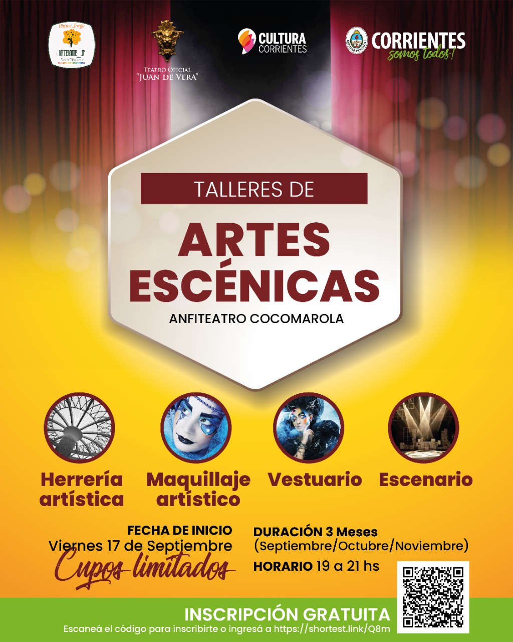 Organizado por el Gobierno de la Provincia, a través del Instituto de Cultura de Corrientes y la dirección de Artes Escénicas, Música y Artes Audiovisuales, está abierta la inscripción para participar de los talleres de artes escénicas que se dictarán a partir del viernes 17 de septiembre, en el anfiteatro Mario del Tránsito Cocomarola. Los mismos serán gratuitos, pero con cupos limitados.