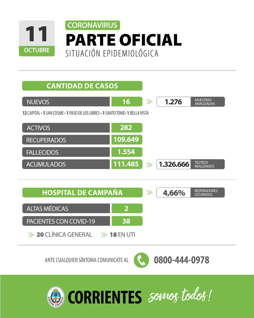 Esto actualiza la cifra de casos activos en 282 y los acumulados en 111.485 en todo el territorio provincial al 11 de octubre de 2021, con 1.326.666 testeos realizados desde que inició la pandemia y 109.649 recuperados.
