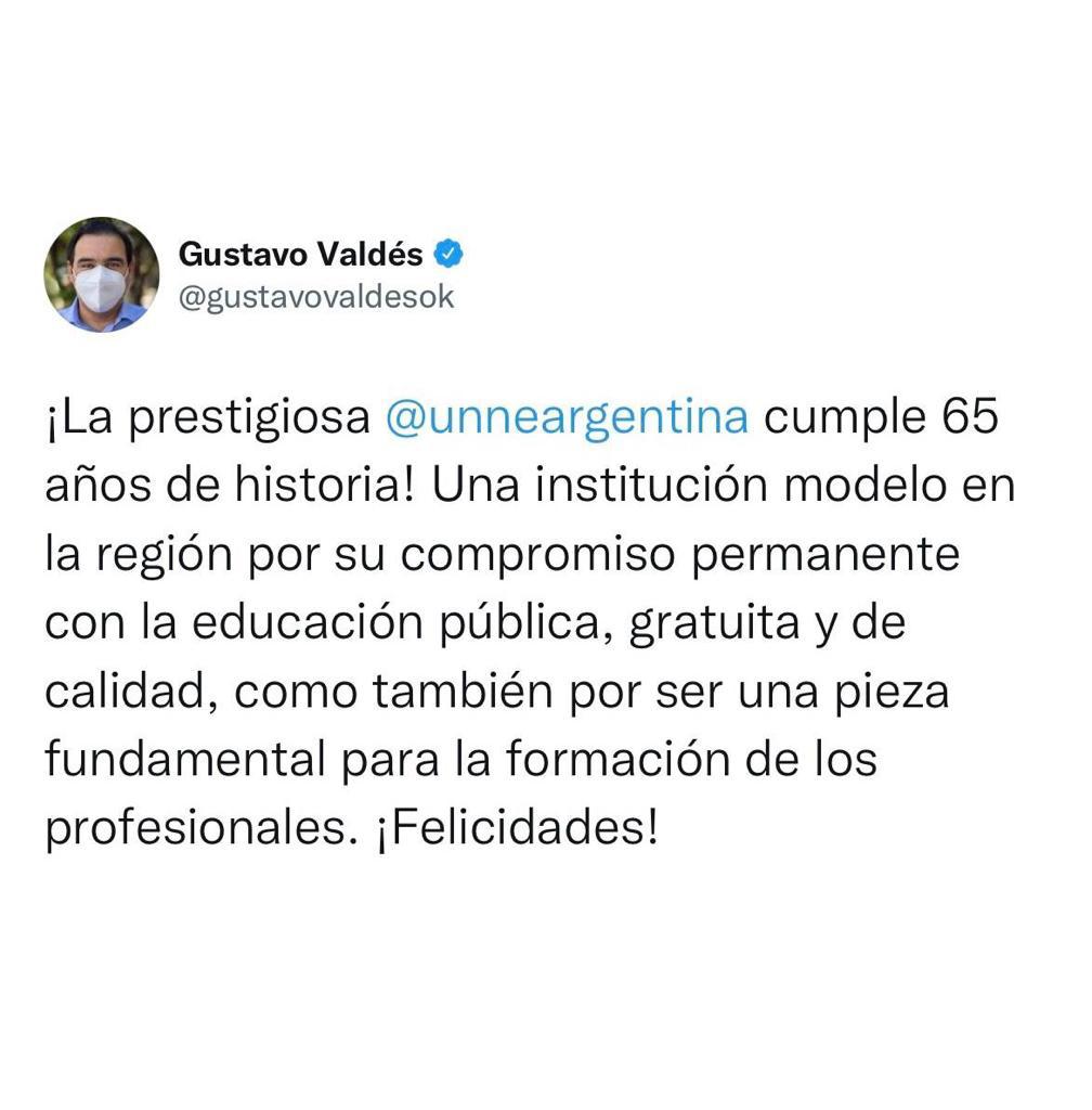 De esta manera, este martes el mandatario a través de su cuenta de Twitter destacó la labor educativa de la institución y expresó sus salutaciones diciendo “la prestigiosa UNNE cumple 65 años de historia”.