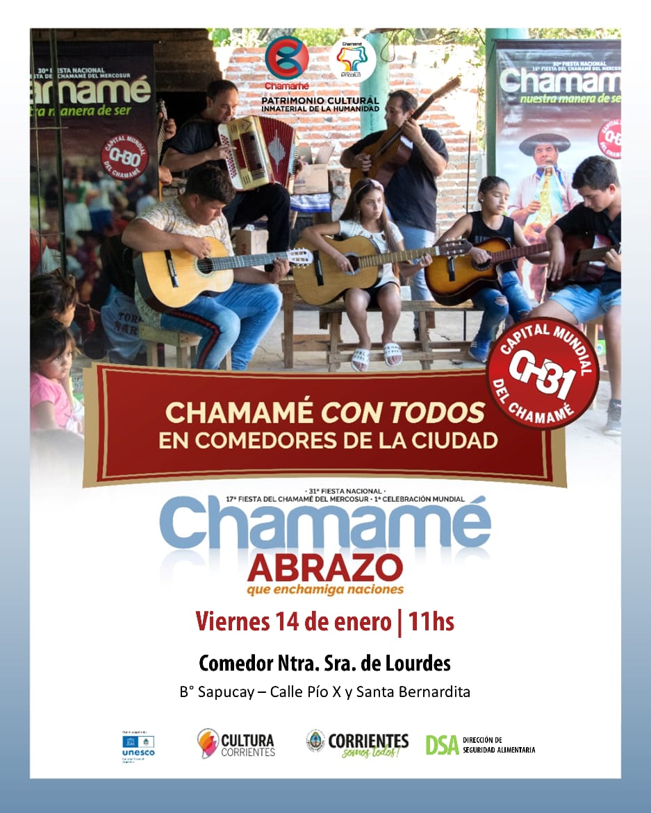 El Ministerio de Desarrollo Social de la Provincia a través de la Dirección de Seguridad Alimentaria, en conjunto con el Instituto de Cultura de Corrientes, impulsan este nuevo programa para acompañar la Fiesta chamamecera. De esta manera, este viernes 14 de enero a partir de las 11 en el Comedor "Nuestra Señora de Lourdes", sito en Calle Pio X y Santa Bernardita de esta Capital, tendrá lugar dicho evento chamamecero con la actuación de grupos folclóricos que serán parte de la grilla de la Fiesta grande.