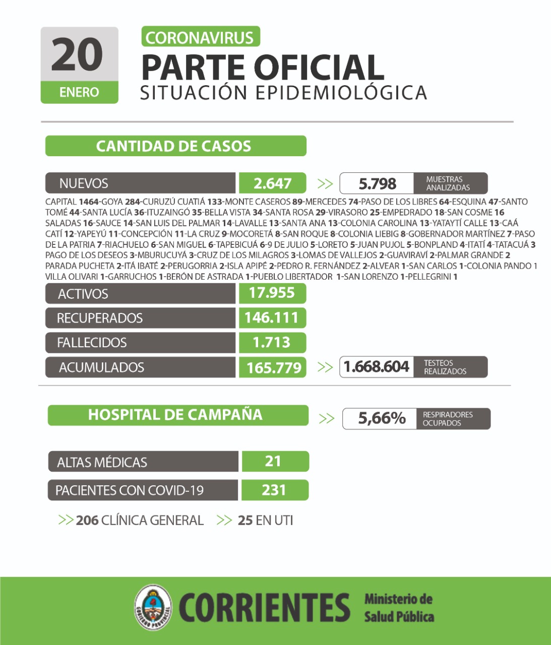 El informe epidemiológico de la provincia de Corrientes registró este jueves 2.647 nuevos casos positivos de Coronavirus, de los cuales 1.464 fueron contagios en la ciudad Capital y los 1.183 restantes en 59 localidades del interior provincial, al haberse analizado 5.798 muestras en las últimas 24 horas.