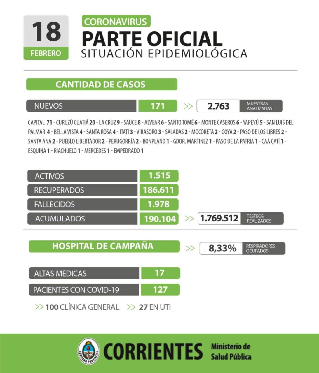 El informe epidemiológico de la provincia de Corrientes registró este viernes 171 nuevos casos positivos de Coronavirus, de los cuales 71 fueron contagios en la ciudad Capital y los 100 restantes en 27 localidades del interior provincial, al haberse analizado 2.763 muestras en las últimas 24 horas.