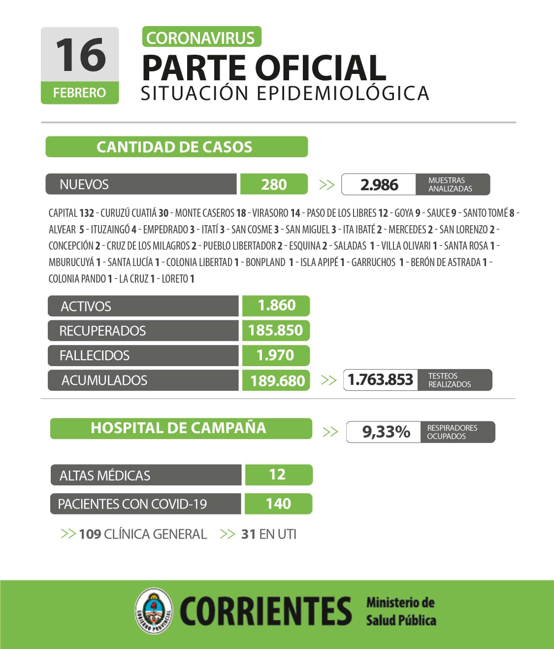 Esto actualiza la cifra de casos activos en 1.860 y los acumulados en 189.680 en todo el territorio provincial al 16 de febrero de 2.022, con 1.763.857 testeos realizados desde que inició la pandemia y 185.850 recuperados.