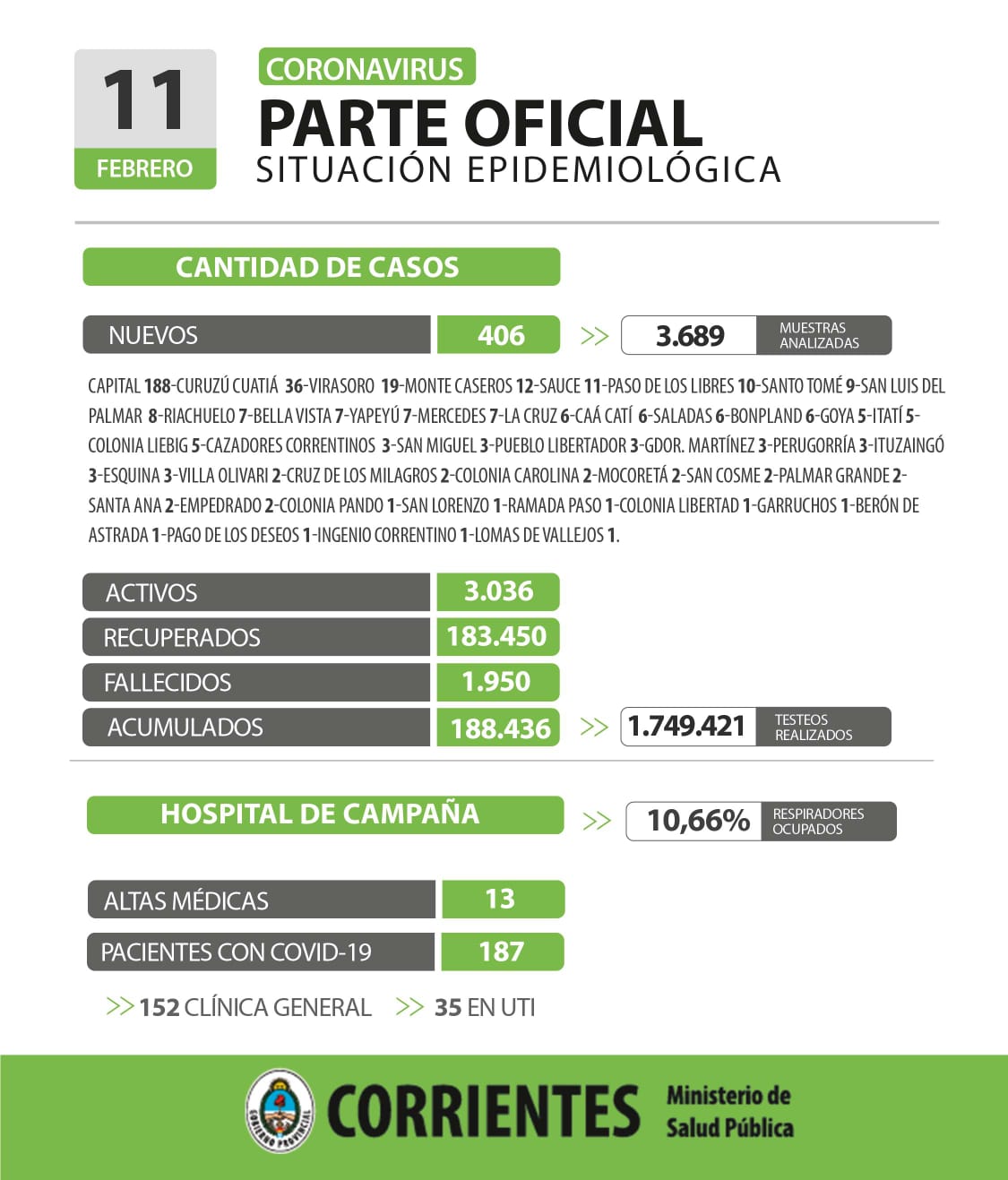 El informe epidemiológico de la provincia de Corrientes registró este viernes 406 nuevos casos positivos de Coronavirus, de los cuales 188 fueron contagios en la ciudad Capital y los 218 restantes en 43 localidades del interior provincial, al haberse analizado 3689 muestras en las últimas 24 horas.