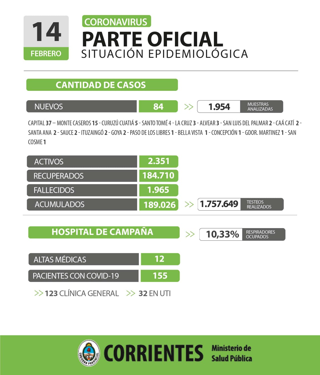 El informe epidemiológico de la provincia de Corrientes registró este lunes 84 nuevos casos positivos de Coronavirus, de los cuales 37 fueron contagios en la ciudad Capital y los 47 restantes en 16 localidades del interior provincial, al haberse analizado 1.954 muestras en las últimas 24 horas.
