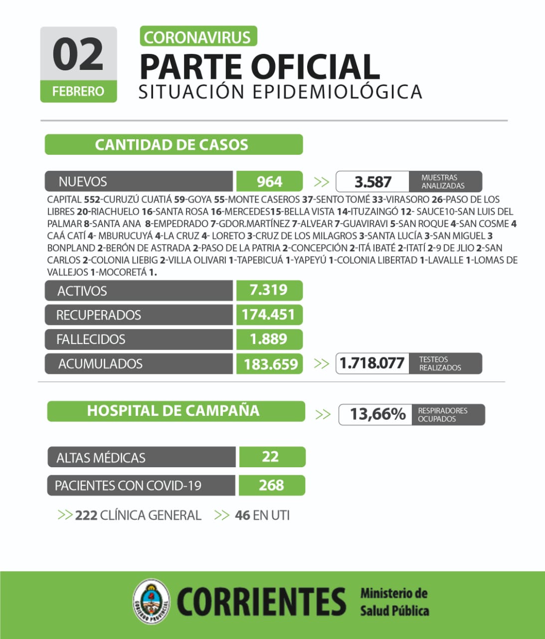 Los nuevos casos son: en la ciudad de Corrientes 552, Curuzú Cuatiá 59, Goya 55, Monte Caseros 37, Santo Tomé 33, Virasoro 26, Paso de los Libres 20, Riachuelo 16, Santa Rosa 16, Mercedes 15, Bella Vista 14, Ituzaingó 12, Sauce 10, San Luis del Palmar 8, Santa Ana 8, Empedrado 7, Gobernador MartÃnez 7, Alvear 7, Guaviravà 5, San Roque 4, San Cosme 4, Caá Catà 4, Mburucuyá 4, La Cruz 4, Loreto 3, Cruz de los Milagros 3, Santa LucÃa 3, San Miguel 3, Bonpland 2, Berón de Astrada 2, Paso de la Patria 2, Concepción 2, Itá Ibaté 2, Itatà 2, 9 de Julio 2, San Carlos 2, Colonia Liebig 2, Villa Olivari 1, Tapebicuá 1, Yapeyú 1, Colonia Libertad 1, Lavalle 1, Lomas de Vallejos 1 y Mocoretá 1.