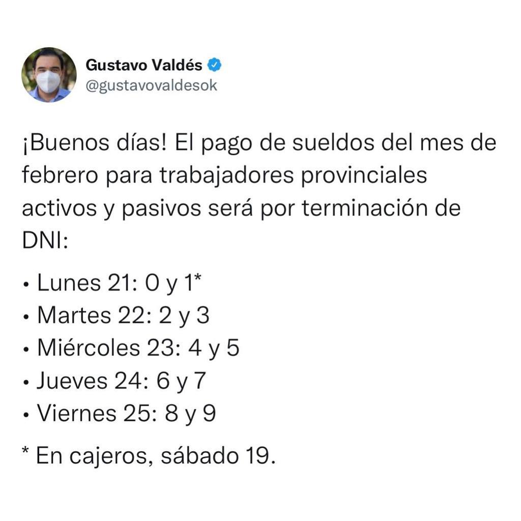 El cronograma de pago del sueldo de febrero comienza este lunes 21, con el pago a los agentes activos-jubilados-pensionados de la administración pública provincial con Documento Nacional de Identidad terminados en 0 y 1.