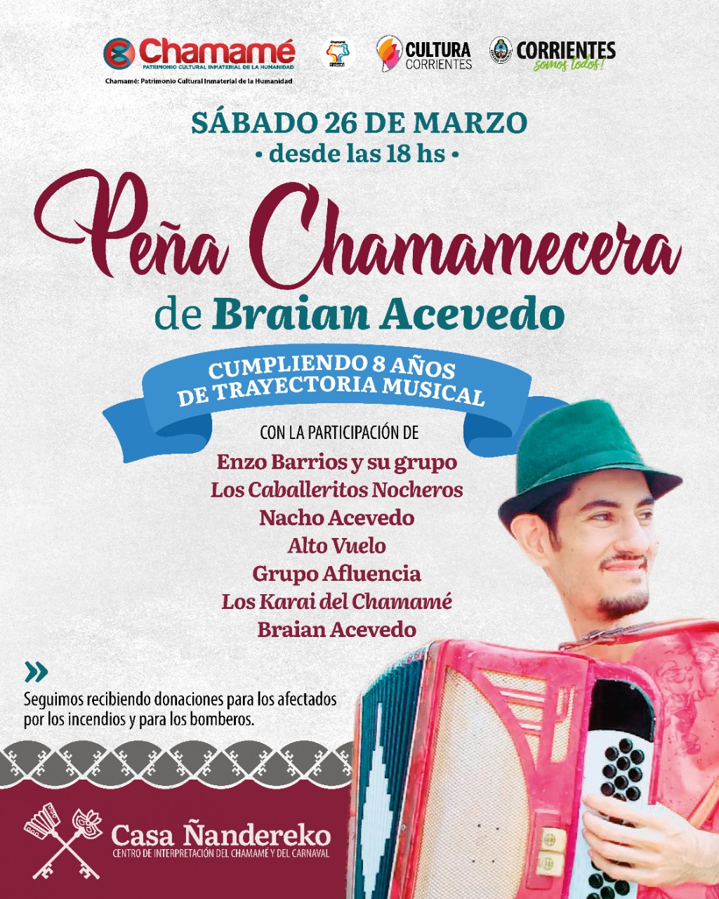 El Instituto de Cultura de Corrientes invita a la peña chamamecera que se realizará este sábado 26 de marzo, a partir de las 18, en Casa Ñanderekó, el Centro de Interpretación del Chamamé y Carnaval ubicado en calle 25 de Mayo 1141. Esta propuesta será con acceso libre y gratuito.