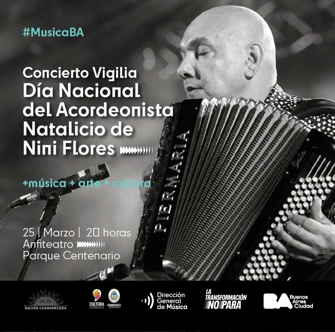 El Ministerio de Cultura de la Ciudad de Buenos Aires, junto al Gobierno de la Provincia de Corrientes, a través del Instituto de Cultura, invitan al concierto por el “Día Nacional del Acordeonista”, en homenaje al natalicio de Nini Flores, a realizarse este viernes 25 de marzo, a las 20, en el porteño anfiteatro de Parque Centenario.