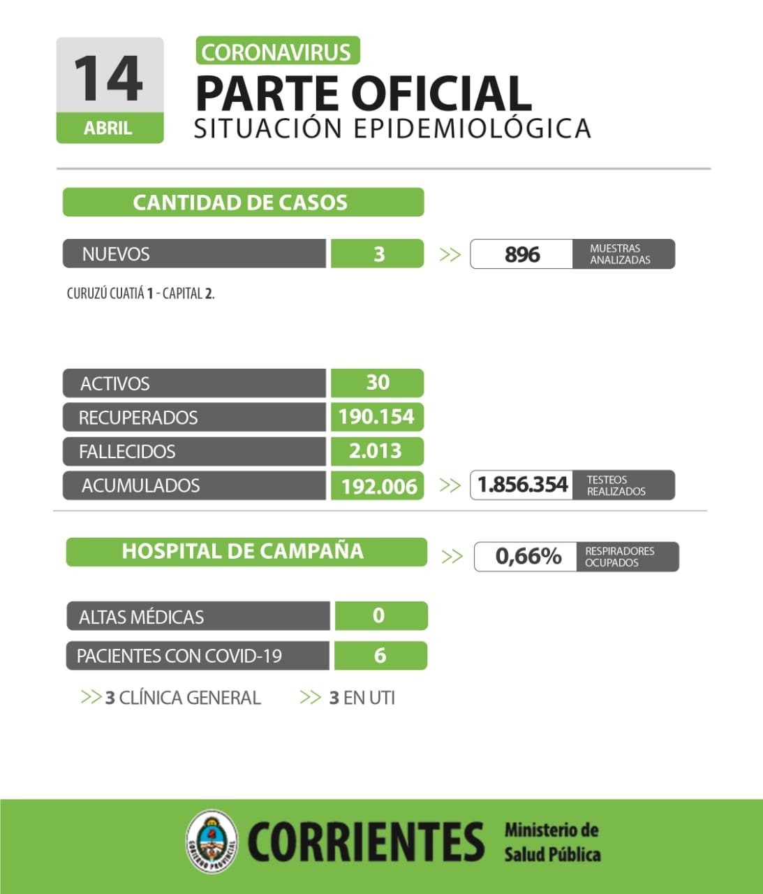 El informe epidemiológico de la provincia de Corrientes registró este jueves, 3 nuevos casos positivos de Coronavirus, de los cuales 2 son en la ciudad Capital y 1 en el interior, al haberse analizado 896 muestras en las últimas 24 horas.