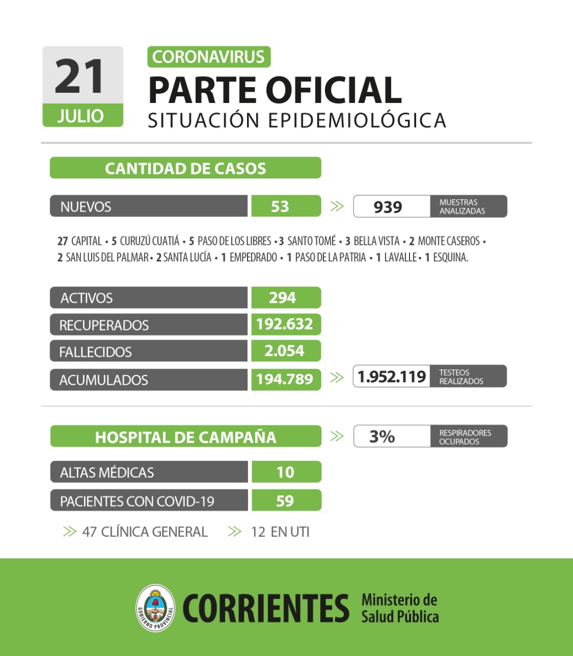 El informe epidemiológico de la provincia de Corrientes registró este jueves 21 de julio, 53 nuevos casos positivos de Coronavirus, de los cuales 27 fueron contagios en la ciudad Capital y los 26 restantes en 11 localidades del interior provincial, al haberse analizado 939 muestras en las últimas 24 horas.