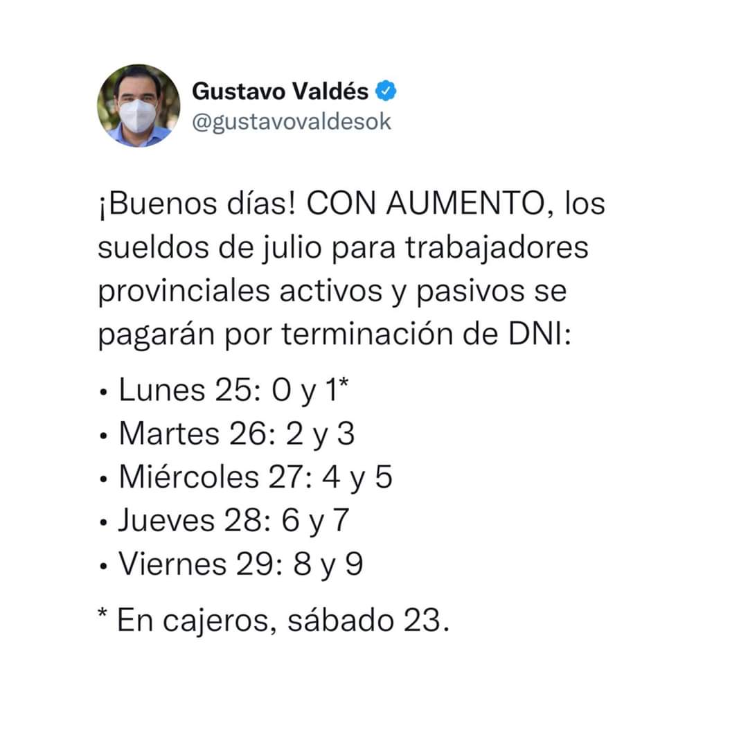 Gustavo Valdés informó, a través de su cuenta de Twitter, el cronograma de haberes con aumento del mes de julio, destinado a trabajadores provinciales activos y pasivos de la Provincia.