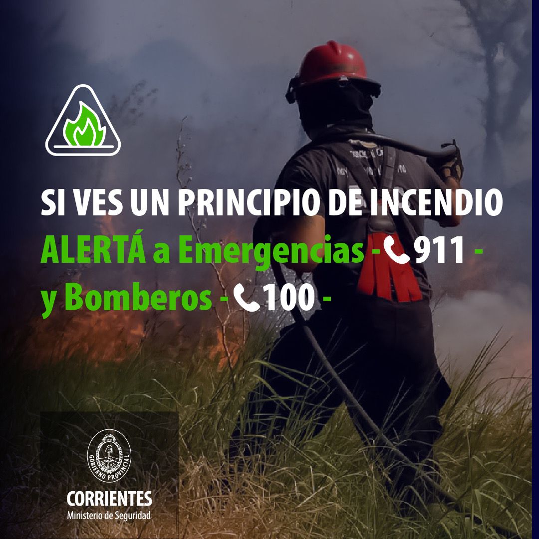 Desde el Ministerio de Seguridad de la Provincia de Corrientes recordamos a la población que, ante una situación de incendio o principio de incendio, es necesario comunicarse a los números de emergencia indicados: 911 (Emergencias) y 100 (Bomberos).