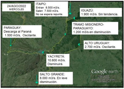 Asimismo, en Santo Tomé tanto como en Paso de los Libres el caudal medio semanal se mantuvo en ascenso si bien el repunte se vio atenuado con respecto al tramo superior. Actualmente se encuentra culminando el tránsito de la última onda en Paso de los Libres. Se prevé que a corto plazo sostenga una leve disminución o estabilidad en rango propio de aguas medias.