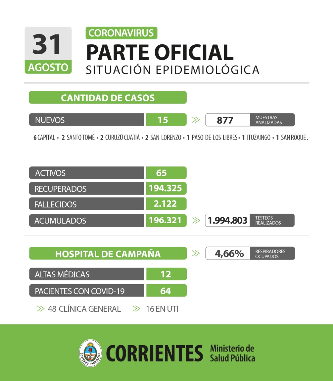 Esto actualiza la cifra de casos activos en 65 y los acumulados en 196.321 en todo el territorio provincial al 31 de agosto de 2022, con 1.994.803 testeos realizados desde que inició la pandemia y 194.325 recuperados.