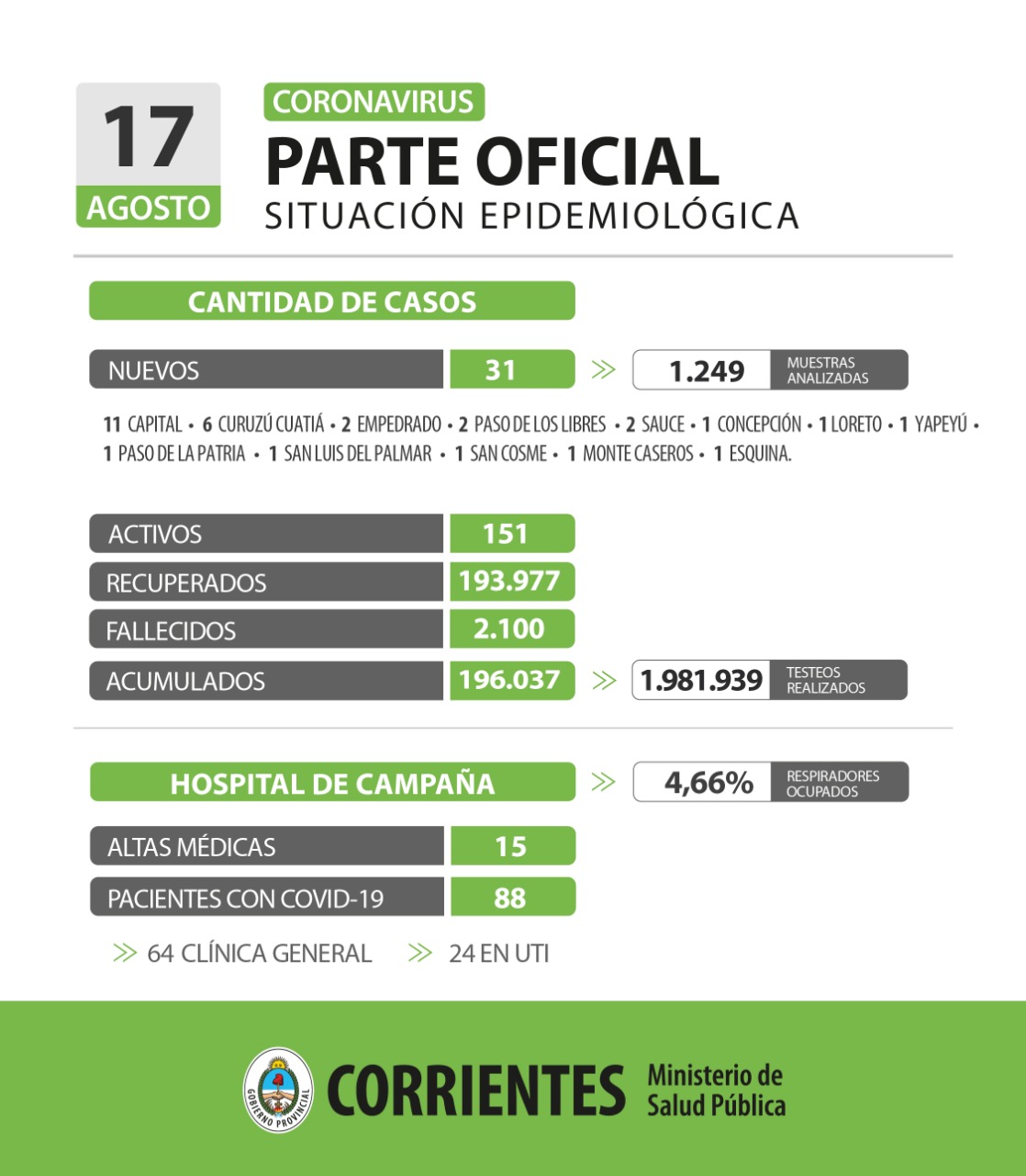 El informe epidemiológico de la provincia de Corrientes registró este miércoles, 31 nuevos casos positivos de Coronavirus, de los cuales 11 fueron contagios en la ciudad Capital y los 20 restantes en 12 localidades del interior provincial, al haberse analizado 1.249 muestras en las últimas 24 horas.
