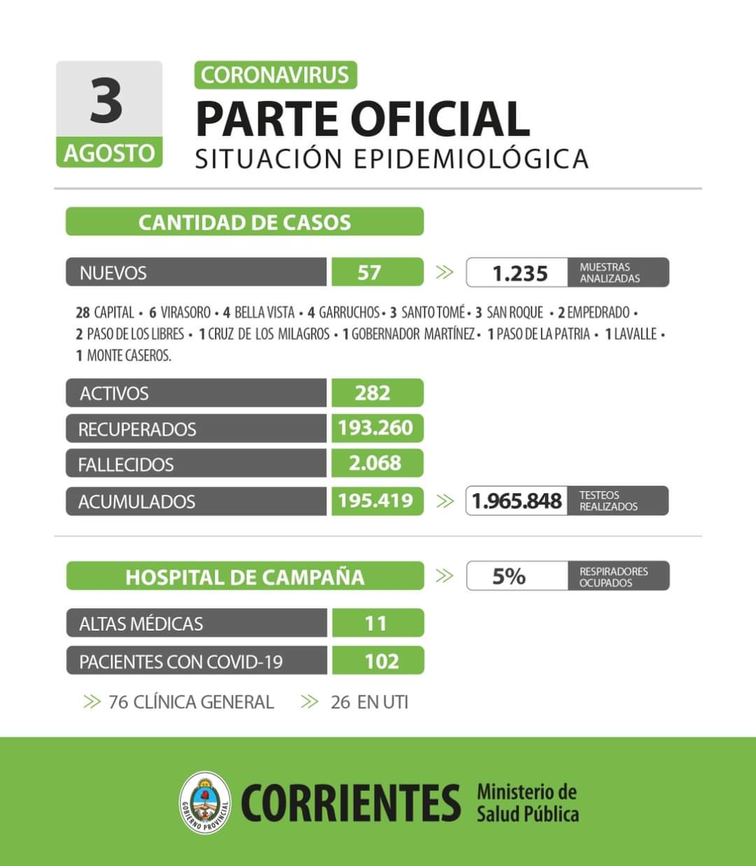 El informe epidemiológico de la provincia de Corrientes registró este miércoles, 57 nuevos casos positivos de Coronavirus, de los cuales 28 fueron contagios en la ciudad Capital y los 29 restantes en 12 localidades del interior provincial, al haberse analizado 1.235 muestras en las últimas 24 horas.