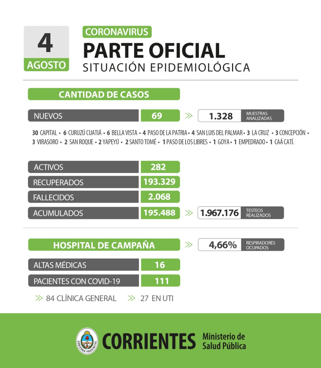 El informe epidemiológico de la provincia de Corrientes registró este jueves 69 nuevos casos positivos de Coronavirus, de los cuales 30 fueron contagios en la ciudad Capital y los 39 restantes en 14 localidades del interior provincial, al haberse analizado 1.328 muestras en las últimas 24 horas.