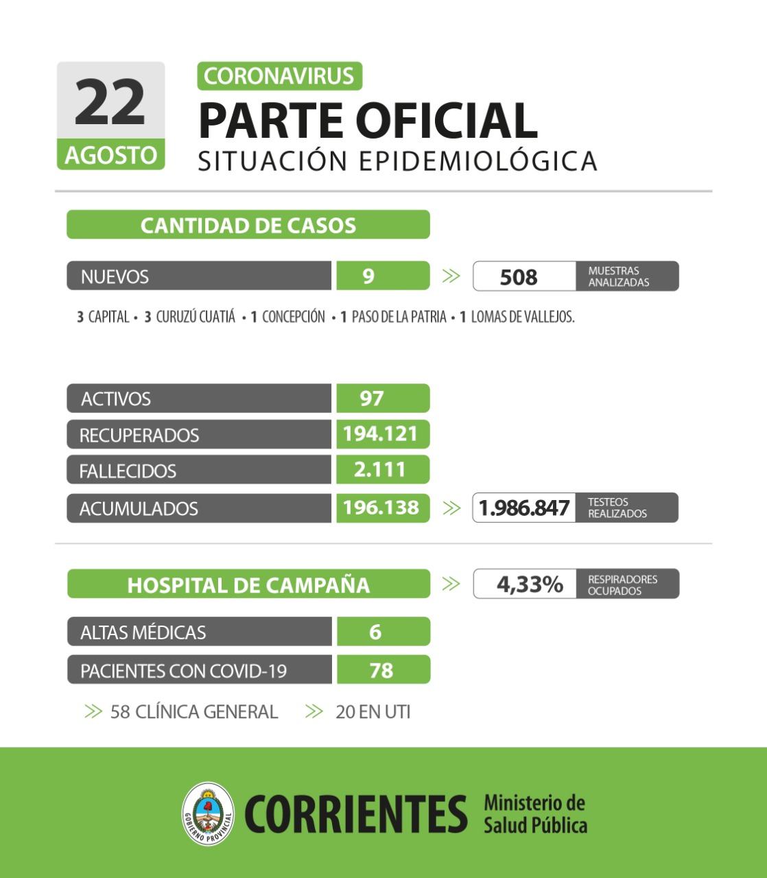 Los nuevos casos son: 3 Capital - 3 Curuzú Cuatiá - 1 Concepción - 1 Paso de la Patria - 1 Lomas de Vallejos.