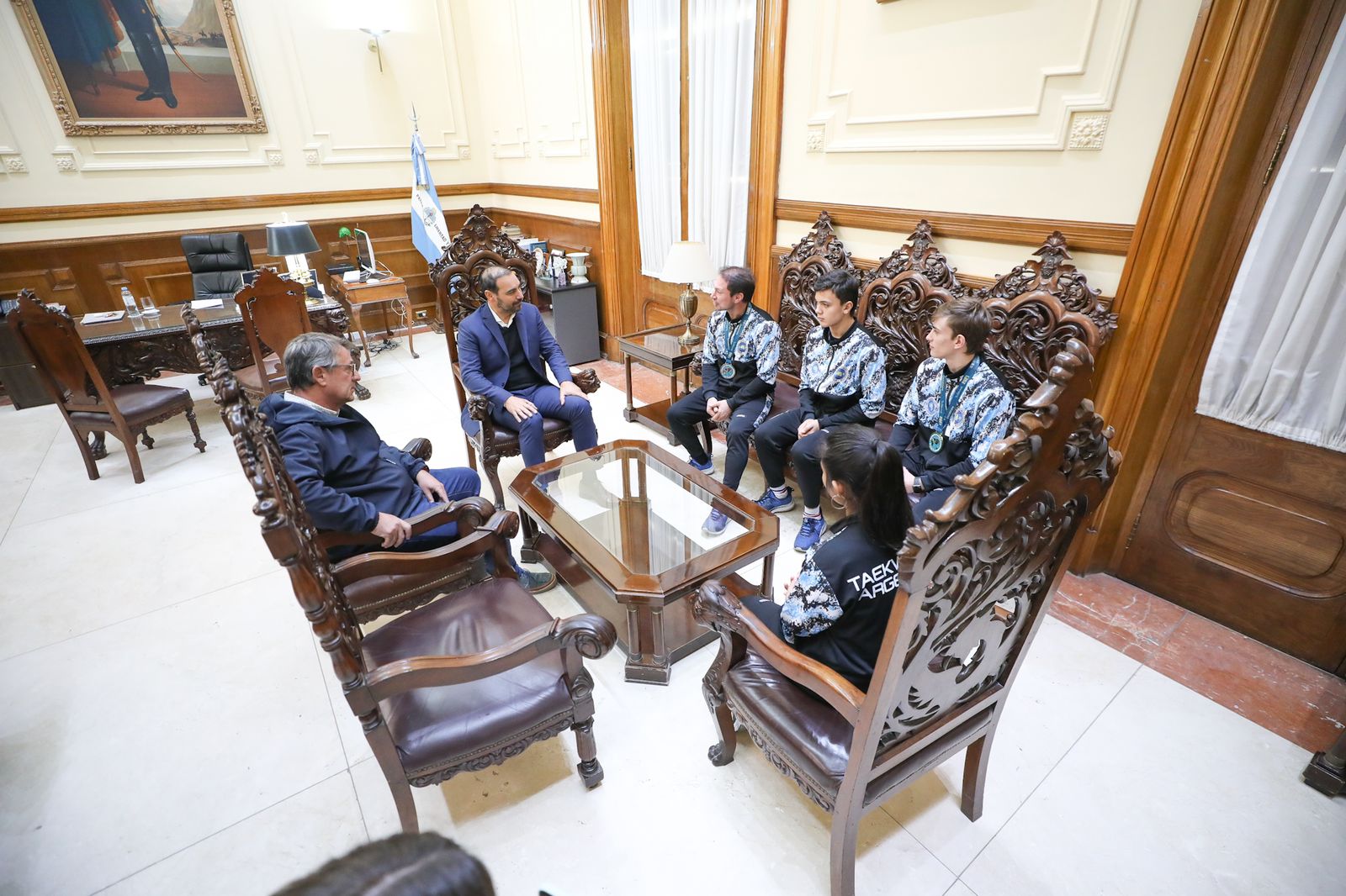 El Gobernador recibió a los cuatro taekwondistas este jueves al mediodía en su despacho oficial en compañía del secretario provincial de Deportes, Jorge Terrile. Los felicitó por los buenos resultados que obtuvieron, los alentó a seguir el camino del esfuerzo y ratificó su compromiso con el deporte en general.