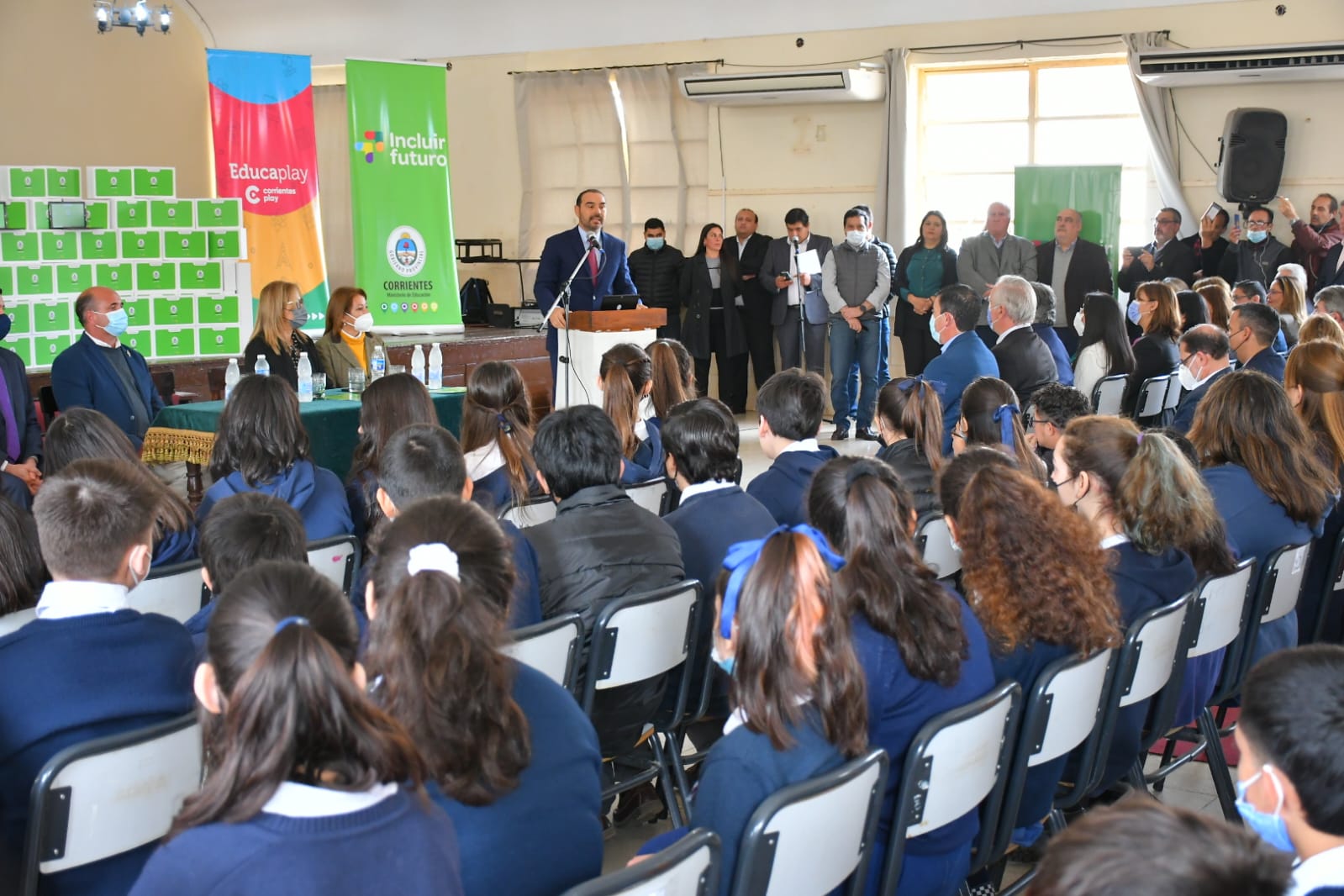 En el acto -realizado en el edificio escolar y con la presencia de la ministra de Educación, Práxedes López y el intendente Diego Caram- Valdés remarcó las bondades del programa Incluir Futuro, que consiste en dotar a cada alumno que ingrese al nivel secundario de una computadora. “Ya compramos unas 26.000 notebooks diseñadas exclusivamente para alumnos correntinos.