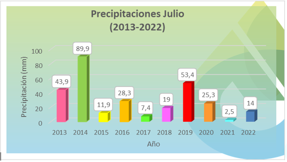 La temperatura máxima registrada durante julio 2022 fue de 32,7ºC el día 26 a las 14:50 horas Mientras que la temperatura mínima mensual fue de 6,3ºC el día 17 de julio a las 08:00 horas. El pasado mes de julio 2022 se sitúa en el tercer lugar (de mayor a menor) en cuanto a temperaturas máximas se refiere de acuerdo a la serie de 2013-2022; tal como se observan en los gráficos comparativos.