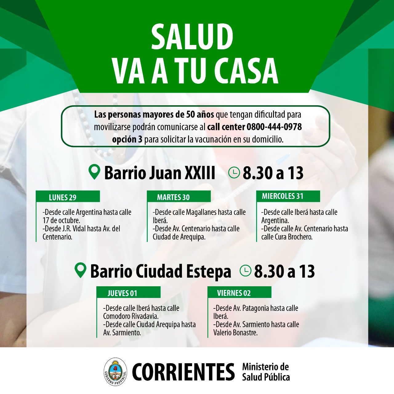 El Ministerio de Salud Pública de la Provincia, a cargo de Ricardo Cardozo, reinicia la campaña de vacunación Covid-19: "Salud va a tu casa". En este contexto, esta semana los agentes recorrerán los barrios Juan XXIII y Ciudad Estepa de la ciudad de Corrientes. La tarea continuará en las distintas zonas que serán previamente comunicadas.