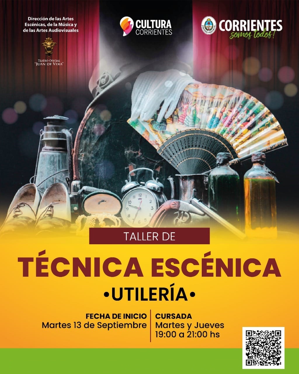 Organizado por el Gobierno de la Provincia, a través del Instituto de Cultura, dará inicio este martes 13 de septiembre, a las 19, el taller de artes escénica sobre utilería, a cargo de los capacitadores: Jorge Pintos (aerografía y tallado), Mauro Robin (arte plástico), Chaco Sánchez (herrería artística) y Eduardo Mambrín (revestimiento y reciclado). Más de 80 personas se anotaron para participar de este espacio de formación a desarrollarse dos veces a la semana en la sede del organismo provincial (San Juan 546).