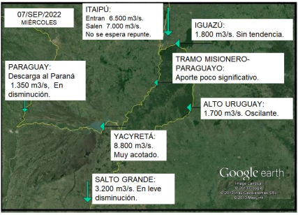Asimismo, las medias semanales se encuentran aproximadamente 1,32 metros por debajo del promedio de septiembre de los últimos 25 años en Corrientes, Barranqueras y Goya. La futura evolución hidrométrica dependerá fuertemente de la evolución de las lluvias en la cuenca de aporte de respuesta más rápida (cuenca del río Iguazú, cuenca próxima al embalse de Itaipú y cuenca de aporte al tramo misioneroparaguayo).