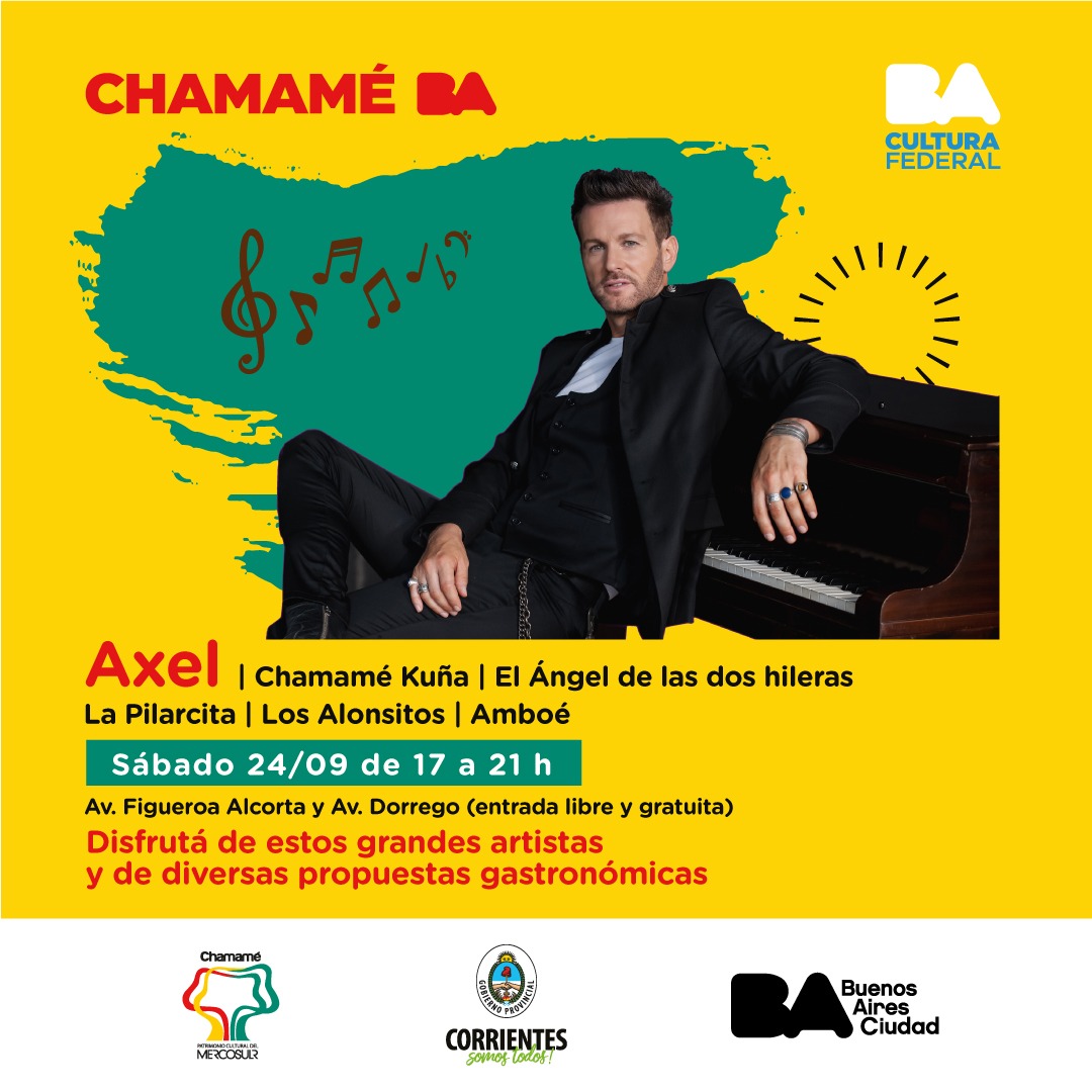 Axel, Los Alonsitos, Amboé y Chamamé Cuñá, La Pilarcita y el Angel de las Dos Hileras, participarán de una programación especial en homenaje a la música chamamecera, Patrimonio de la Humanidad. La cita será este sábado, 24 de septiembre, de 17 a 21 horas en Avenida Figueroa Alcorta y Dorrego, en la Ciudad Autónoma de Buenos Aires, con entrada libre y gratuita, para que los vecinos y la comunidad en general puedan sentir en vivo la esencia cultural del Litoral.