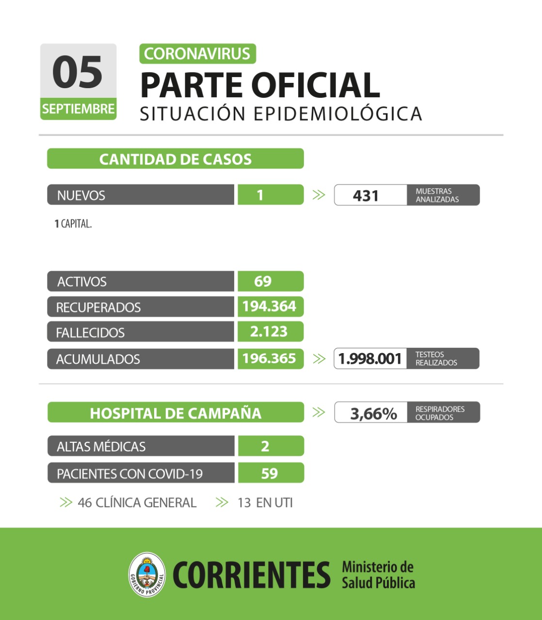 Esto actualiza la cifra de casos activos en 69 y los acumulados en 196.365 en todo el territorio provincial al 5 de septiembre de 2022, con 1.998.001 testeos realizados desde que inició la pandemia y 194.364 recuperados.
