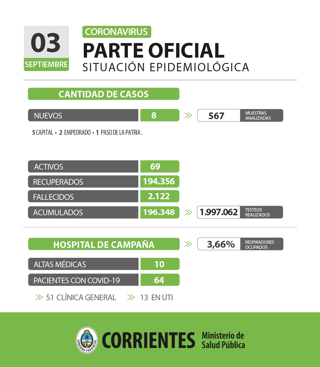 Esto actualiza la cifra de casos activos en 69 y los acumulados en 196.348 en todo el territorio provincial al 3 de septiembre de 2022, con 1.997.062 testeos realizados desde que inició la pandemia y 194.356 recuperados.