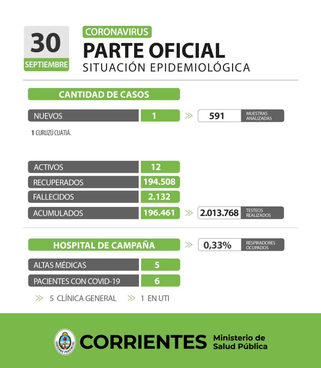 Esto actualiza la cifra de casos activos en 12 y los acumulados en 196.461 en todo el territorio provincial al 30 de septiembre de 2022, con 2.013.768 testeos realizados desde que inició la pandemia y 194.508 recuperados.