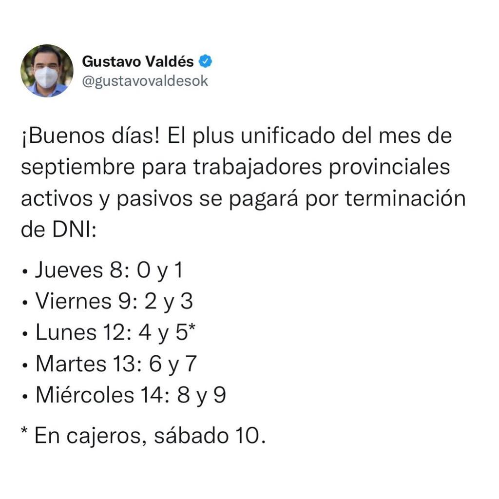 El pago del Plus unificado del mes de septiembre para trabajadores provinciales activos y pasivos comenzará a pagarse a partir de este jueves 8. Así lo anunció el gobernador Gustavo Valdés en su cuenta de Twitter.