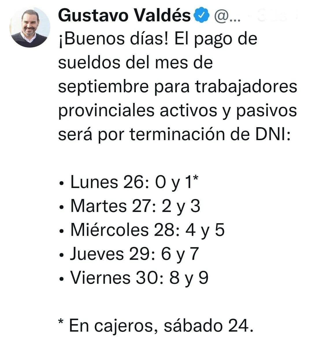El gobernador Gustavo Valdés anunció el cronograma de liquidación de sueldos de septiembre a los agentes de la administración pública provincial. El pago se realizará entre este lunes 26 y el viernes 30.