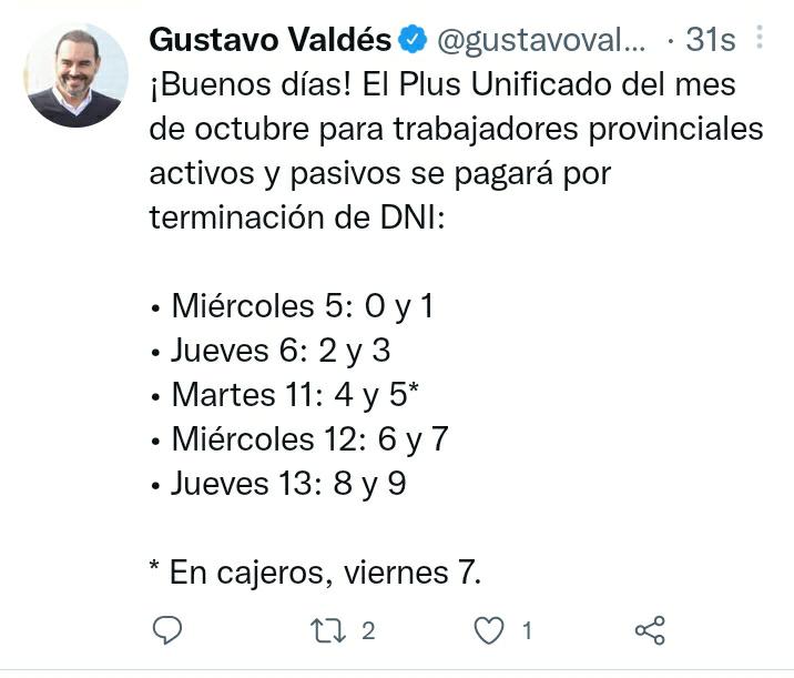 El gobernador Gustavo Valdés confirmó los días de pago del Adicional Remunerativo Mensual de octubre; el cronograma se ejecutará desde este miércoles 5 al próximo jueves 13.